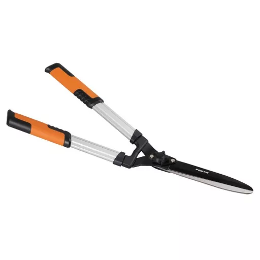 Sövényolló - egyenes penge, minőségi anyagok felhasználása és precíz megmunkálása, elliptikus profilú alumínium fogantyúk műanyag ütközővel, ergonomikusan kialakított fogantyúk garantálják a kényelmes munkát és a biztos fogást, felhasználás: sövény, bokrok, fák nyírására.