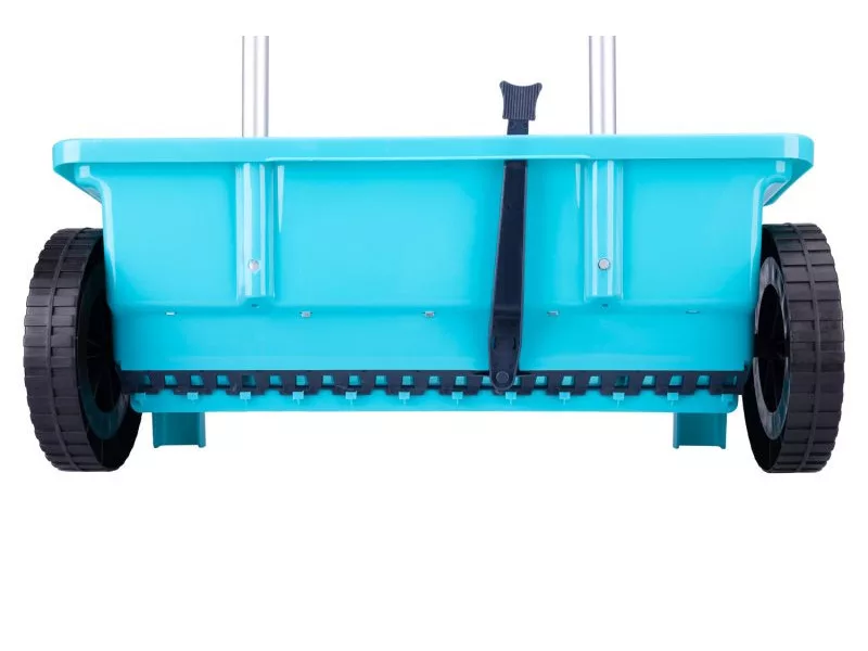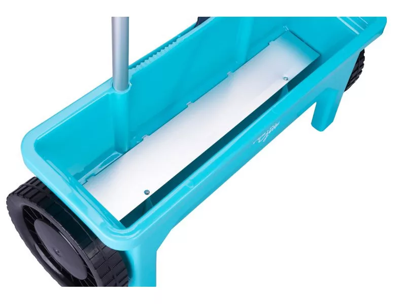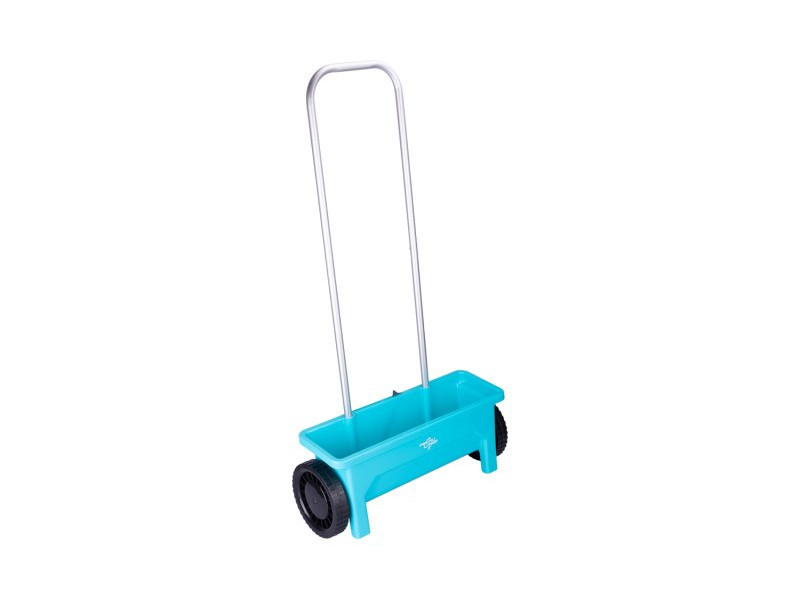 Műanyag szórókocsi 12 l űrtartalommal vetőmag, műtrágya és só számára.