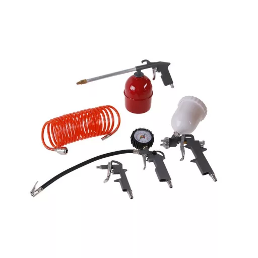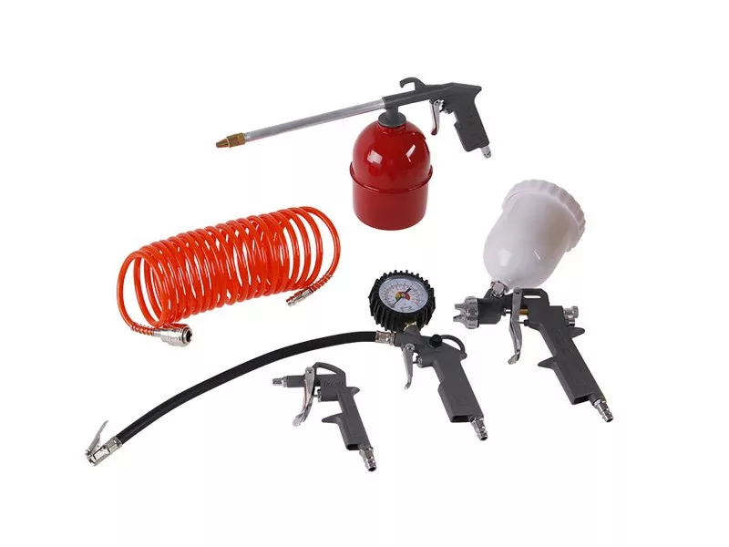 A kompresszorkészlet egy nyomásmérővel ellátott felfújható pisztolyból áll - a sűrített levegővel való könnyű feltöltéshez (pl. autók, kerékpárok abroncsai stb.), egy szórópisztoly alsó és felső töltettel - festékanyagok (lakkok, szintetikus és víz) felviteléhez -bázisú festékek) felületekre, fúvópisztoly - pl. fémpor kifújására nehezen elérhető helyekről, spiráltömlő 5m - pneumatikus szerszámok kompresszorhoz történő csatlakoztatásához. Üzemi nyomás 5 bar - max 8 bar.