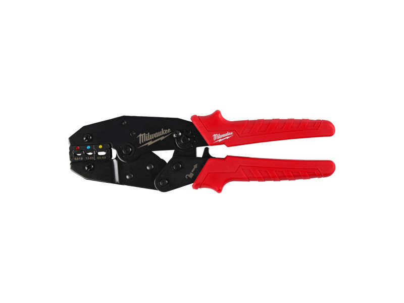 3 krimpelő nyílás, amelyekkel egyetlen szerszámmal többféle méretű csatlakozó krimpelhető: piros (0,3 - 1,0 mm²), kék (1,5 - 2,5 mm²) és sárga (4,0 - 6,0 mm²).