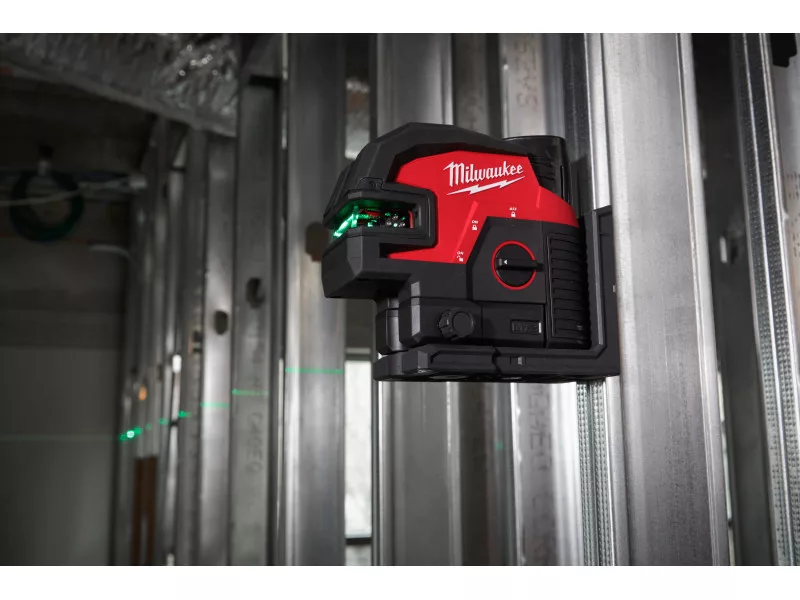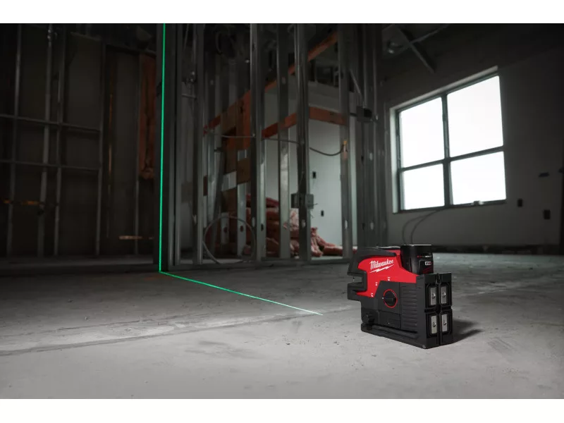 • Der M12™ grüne Kreuzlinienlaser mit 4 Punkten bietet eine All-in-One-Funktion: horizontales Nivellieren, vertikale Ausrichtung, vertikale Punktabgabe vom Boden zur Decke und horizontale Punktabgabe