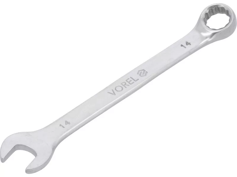 14 mm flat key from Vorel 51679. Made of CRV chrome-vanadium steel. Matrical forged key, perfectly tuned. The satin finish is minimized by the slip of the pollution key. A two -angle eyelet tip, additionally bent, which makes it easier to maneuver with the key.