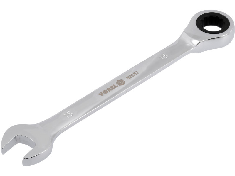 Flat-pocket key with a 15 mm ratio of Vorel 52657. Made of CRV chrome-vanadium steel. The ratchet has 72 teeth. The surface finished with chrome.