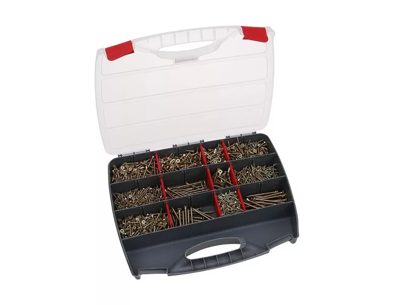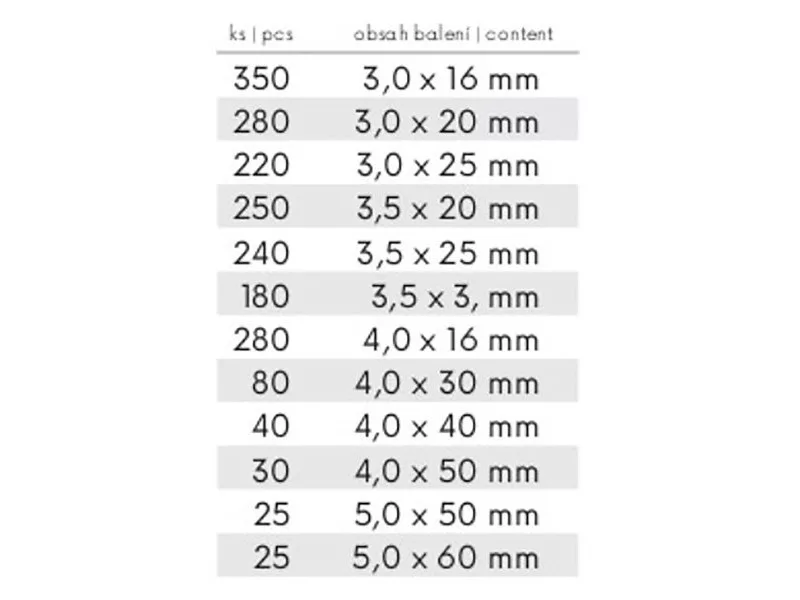 Alapvető facsavarok készlete műanyag rendszerezőben. Alkalmas minden otthoni műhelyhez. A készlet 12 féle csavart tartalmaz, összesen 2000 db. 350 db - 3.0x16mm, 280 db - 3.0x20mm, 220 db - 3.0x25mm, 250 db - 3.5x20mm, 240 db - 3.5x25mm, 180 db - 3.5x30mm, -6 mm., -480x 30mm, 40 db - 4.0x40mm, 30 db - 4.0x50mm, 25 db - 5.0x50mm, 25 db - 5.0x60mm.