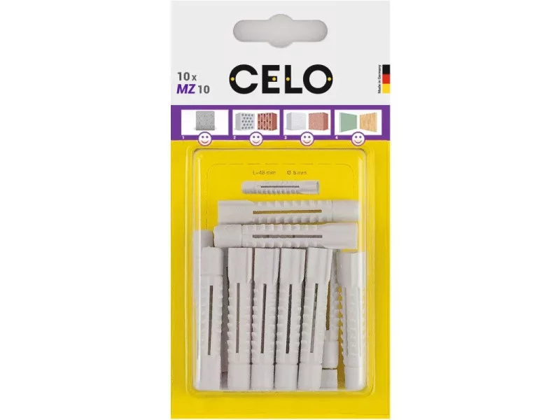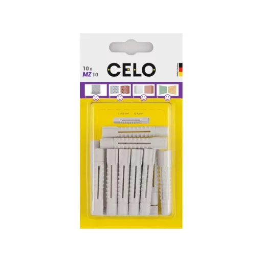Der universelle CELO MZ Dübel hat seine Exzellenz millionenfach bewiesen und kann in nahezu jedem Baumaterial verwendet werden. Die 4-Wege-Expansion des Dübels in Vollmaterialien und sein Knoteneffekt in Hohlräumen und Gipskarton sorgen immer für eine angemessene Fixierung mit hoher Tragfähigkeit. Er ist kompatibel mit verschiedenen Schraubentypen und -größen. Enthält hochwertiges Polyethylen, das die dauerhafte Flexibilität des MZ Universal-Dübels gewährleistet.