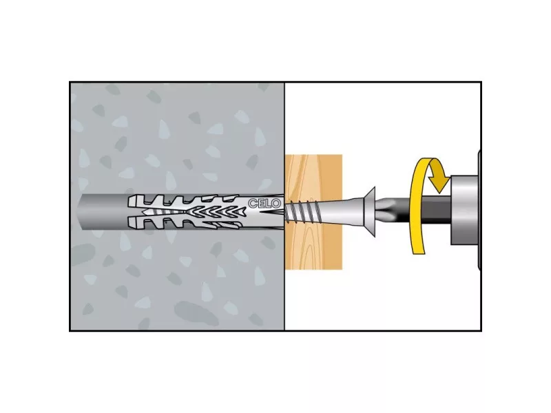 Dank seiner hohen Expansionsfähigkeit bietet der Allzweckdübel CELO F eine hohe Auszugswerte. Es ist in einer breiten Palette von Durchmessern von 4-20 mm erhältlich. Der Allzweckdübel F ist eine ideale Wahl für Vollbaustoffe, bietet aber auch gute Lastwerte in Hohlziegeln und Porenbetonstrukturen. Dank seiner guten Schraubenführung bewegt sich die Schraube beim Antrieb nicht.