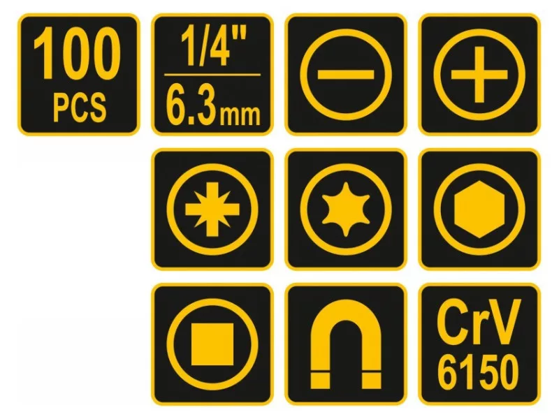 • 60 bits 25 mm: - flat: 3, 3.5, 4, 4.5, 5, 5.5, 6, 6.5, 7, 8 mm - Phlillips: PH0 x 2, PH1 x 2, PH2 x 3, PH3 x 3 - Pozidriv: PZ0 x 2, PZ1 x 2, PZ2 x 3, PZ3 x 3 - TORX: T6, T8, T10, T15, T20, T25, T27, T30, T35, T40 - HEX metric: 2, 2.5, 3, 3.5, 4, 4.5, 5, 5.5, 6, 7 mm - HEX inch: 9/64, 1/8, 5/32, 3/16, 7/32, 1/4″ - square: S0, S1, S2, S3