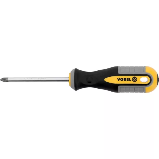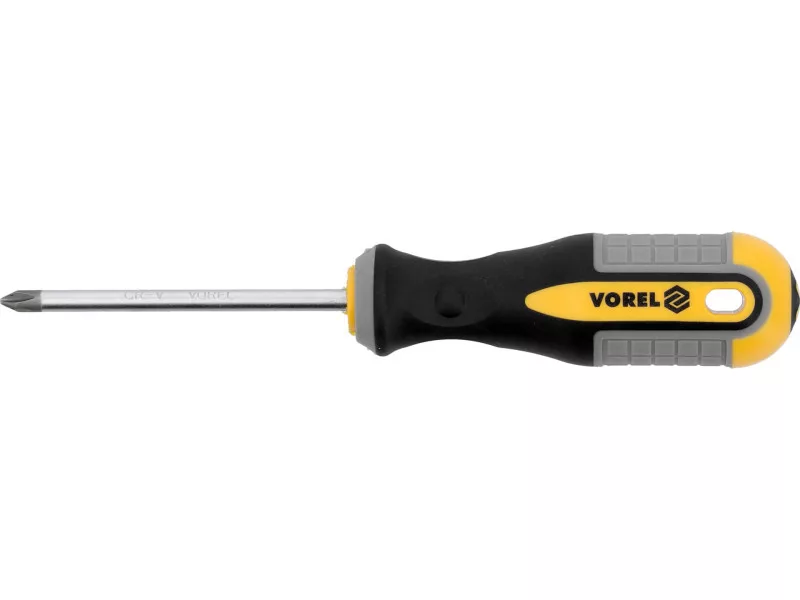 Teutonic screwdriver pH1x75 mm by Vorel 60963. Made of CRV chrome-vanadium steel. The cave has a satin finish, additionally sandblasted and magnetized, which allows a reliable head of the screw. The handle was made of two composite plastic. The hole in the handle allows the screwdriver to be suspended.