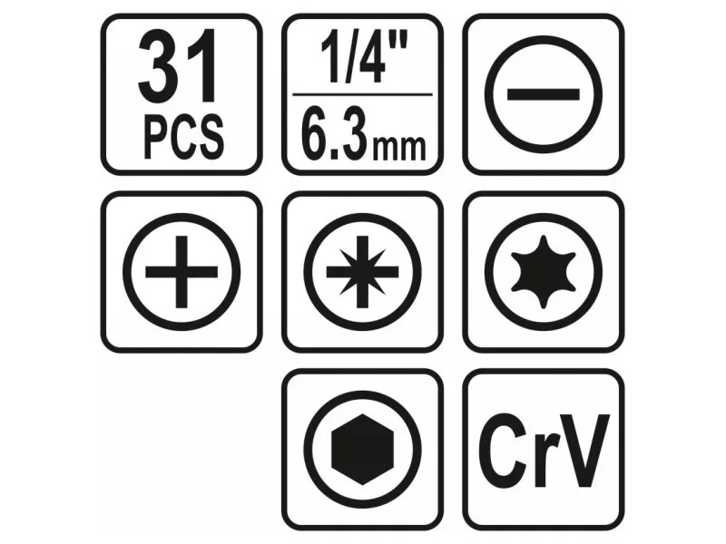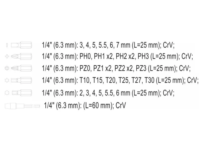 | Tip | level, Phillips, Pozidriv, Torx, hexagonal |