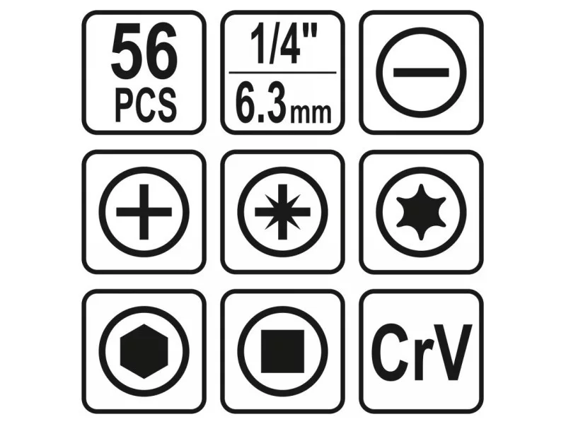 | Tip | flat, Phillips, Pozidriv, Torx, hexagonal, square |