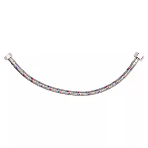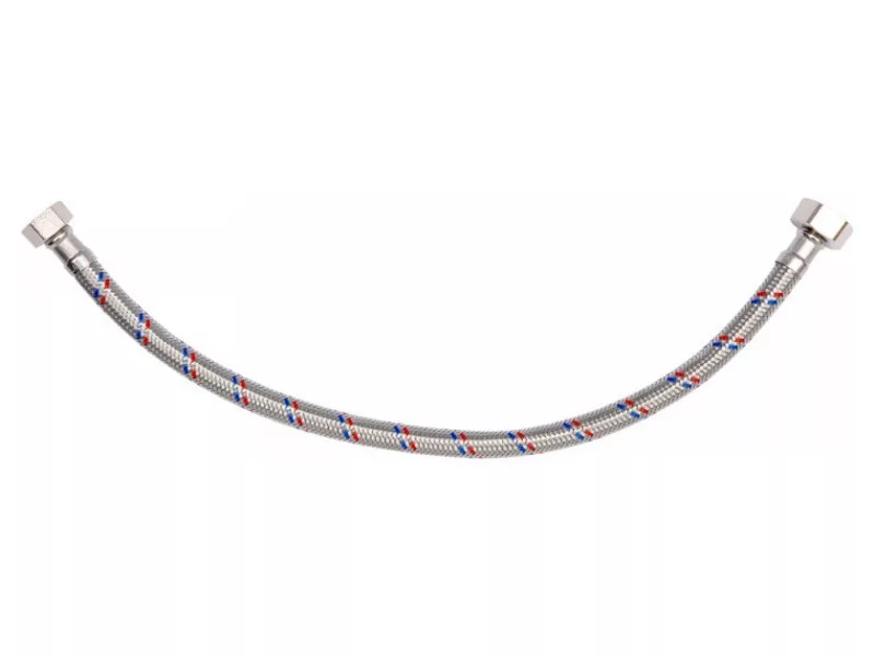 Flexible stainless steel braided connection hose. It is designed for hot and cold water. It has a PZH certificate for contact with drinking water. Length 400mm. Max pressure 1MPa. Max temp 70st C. Average flow rate 32L/min. Inner diameter 8mm and outer diameter 12mm. Connection thread: female 1/2" x female 3/8". Rubber hose made of EPDM rubber, nickel-plated brass connections, EPDM rubber gasket. It is designed from the connection of toilet cisterns or valves. It is designed from the connection of toilet cisterns or valves.
