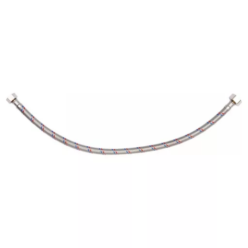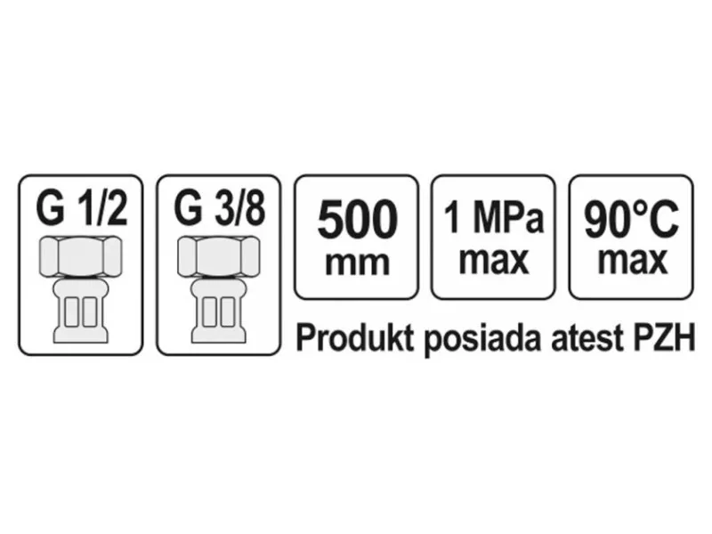 Flexible stainless steel braided connection hose. It is designed for hot and cold water. It has a PZH certificate for contact with drinking water. Length 500mm. Max pressure 1MPa. Max temp 90st C. Average flow rate 32L/min. Inner diameter 8mm and outer diameter 12mm. Connection thread: female 1/2" x female 3/8". Rubber hose made of EPDM rubber, nickel-plated brass connections, EPDM rubber gasket. It is designed from the connection of toilet cisterns or valves.