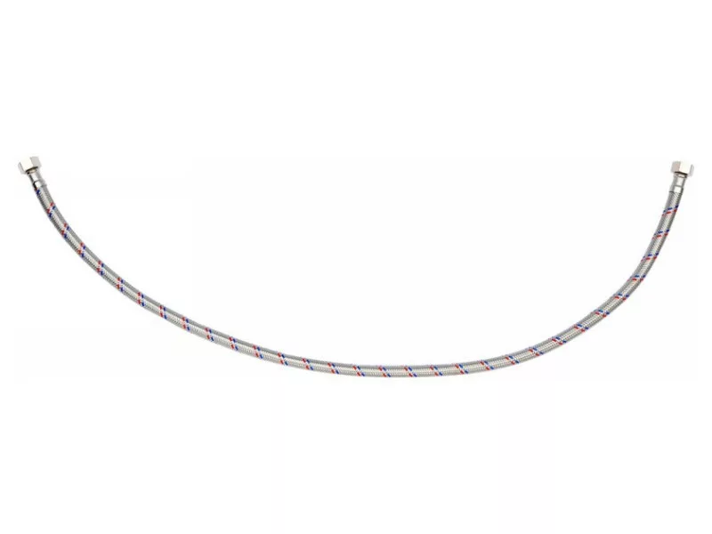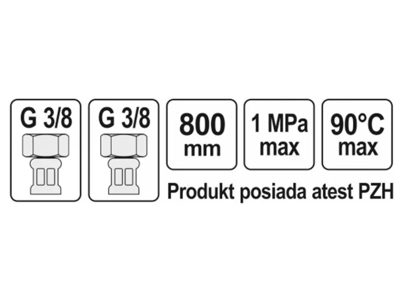 Flexible stainless steel braided connection hose. It is designed for hot and cold water. It has a PZH certificate for contact with drinking water. Length 800mm. Max pressure 1MPa. Max temp 90st C. Average flow rate 32L/min. Inner diameter 8mm, and outer diameter 12mm. Connection thread: female 3/8" x female 3/8". Rubber hose made of EPDM rubber, nickel-plated brass connections, EPDM rubber gasket. It is designed from the connection of toilet cisterns or valves.