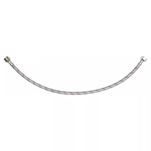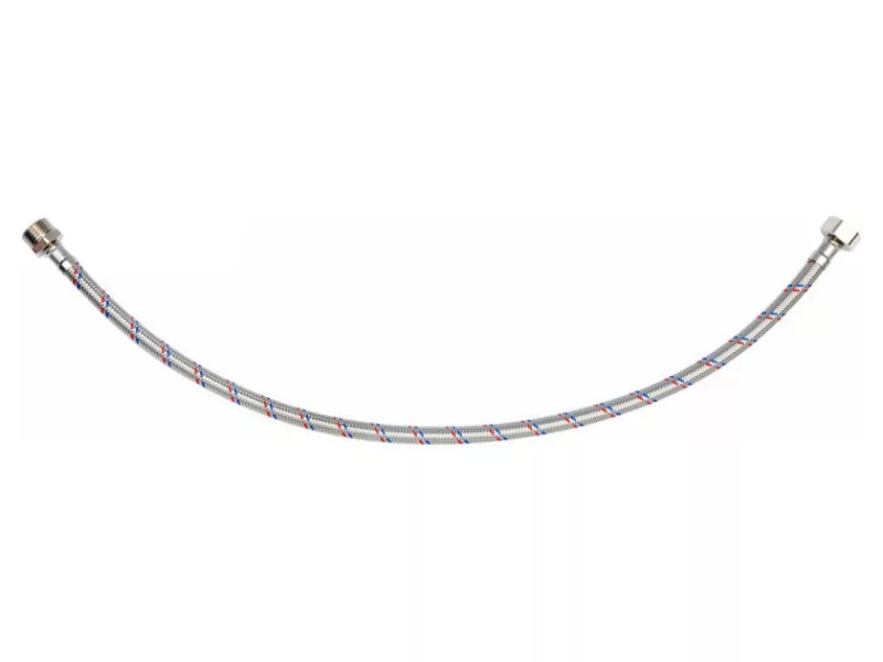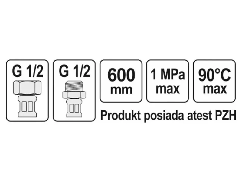 Flexible stainless steel braided connection hose. It is designed for hot and cold water. It has a PZH certificate for contact with drinking water. Length 600mm. Max pressure 1MPa. Max temp 90st C. Average flow rate 32L/min. Internal diameter 8mm, and external diameter 12mm. Connection thread: female 1/2" x male 1/2". Rubber hose made of EPDM rubber, nickel-plated brass connections, EPDM rubber gasket. It is designed from connecting toilet cisterns or valves.