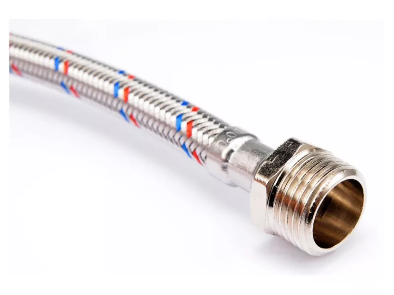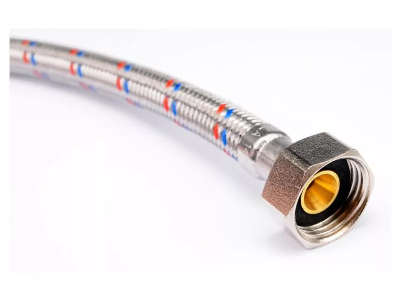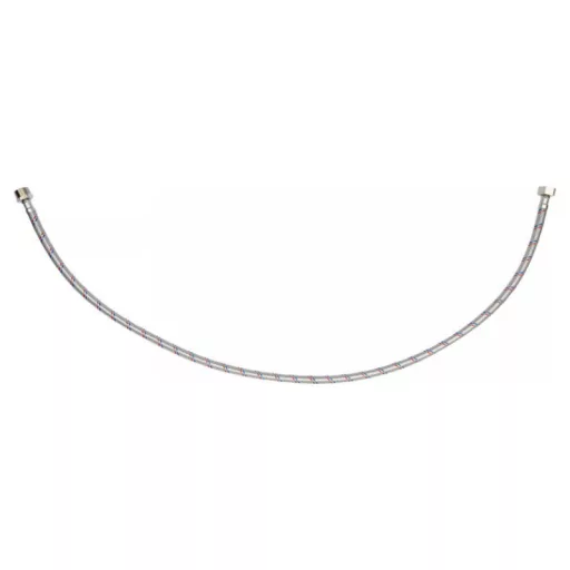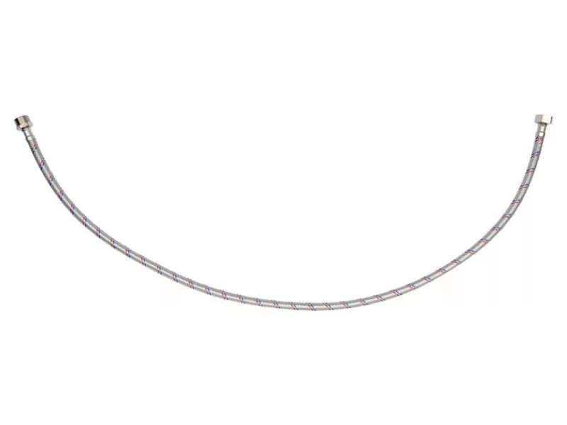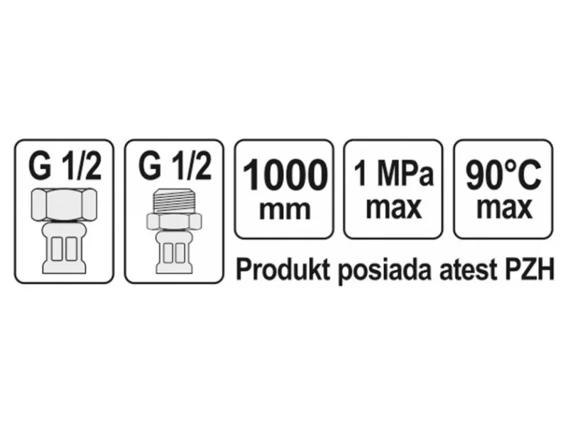 Flexible stainless steel braided connection hose. It is designed for hot and cold water. It has a PZH certificate for contact with drinking water. Length 1000mm. Max pressure 1MPa. Max temp 90st C. Average flow rate 32L/min. Inner diameter 8mm and outer diameter 12mm. Connection thread: female 1/2" x male 1/2". Rubber hose made of EPDM rubber, nickel-plated brass connections, EPDM rubber gasket. It is designed from connecting toilet cisterns or valves.