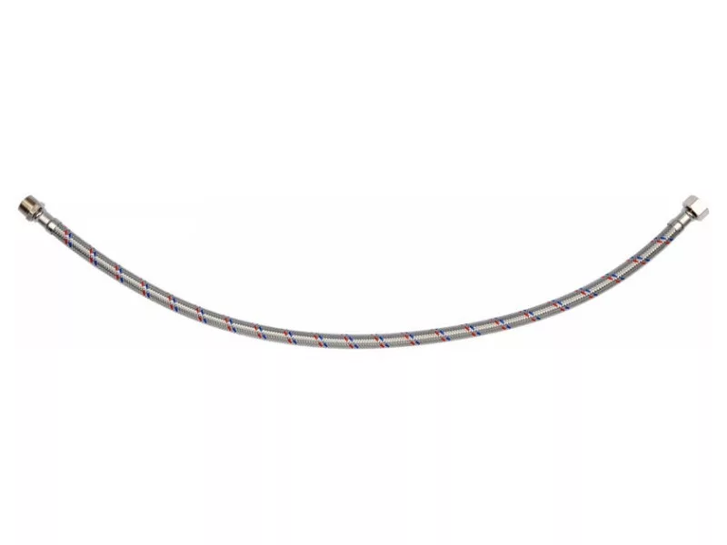 Flexible stainless steel braided connection hose. It is designed for hot and cold water. It has a PZH certificate for contact with drinking water. Length 600mm. Max pressure 1MPa. Max temp 90st C. Average flow rate 32L/min. Inner diameter 8mm, and outer diameter 12mm. Connection thread: female 3/8" x male 3/8". Rubber hose made of EPDM rubber, nickel-plated brass connections, EPDM rubber gasket. It is designed from the connection of toilet cisterns or valves.