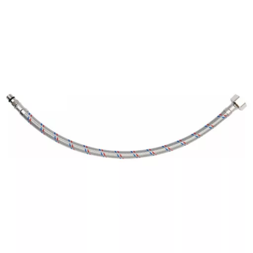 Flexible stainless steel braided connection hose for faucets. It is designed for hot and cold water. It is certified by the PZH for contact with drinking water. Length 400mm. Max pressure 1MPa. Max temp 90st C. Average flow rate 32L/min. Inner diameter 8mm and outer diameter 12mm. Connection thread: female 1/2" x male M10 (17mm short). Rubber hose made of EPDM rubber, nickel-plated brass connections, EPDM rubber gasket. It is designed from the connection of basin and bathtub taps with valves.