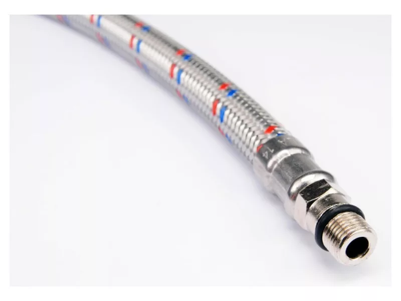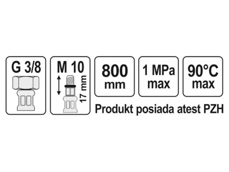 Flexible stainless steel braided connection hose for faucets. It is designed for hot and cold water. It is certified by the PZH for contact with drinking water. Length 800mm. Max pressure 1MPa. Max temp 90st C. Average flow rate 32L/min. Inner diameter 8mm and outer diameter 12mm. Connection thread: female 3/8" x male M10 (17mm short). Rubber hose made of EPDM rubber, nickel-plated brass connections, EPDM rubber gasket. It is designed from the connection of basin and bathtub taps with valves.