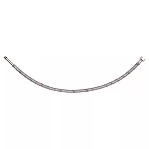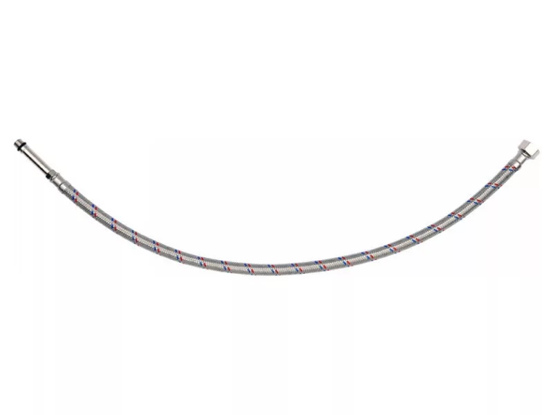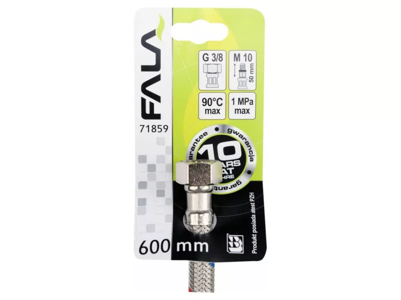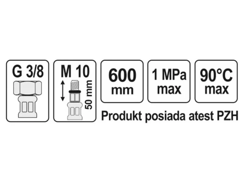Flexible stainless steel braided connection hose for faucets. It is designed for hot and cold water. It is certified by the PZH for contact with drinking water. Length 600mm. Max pressure 1MPa. Max temp 90st C. Average flow rate 32L/min. Inner diameter 8mm, and outer diameter 12mm. Connection thread: female 3/8" x male M10 (50mm long). Rubber hose made of EPDM rubber, nickel-plated brass connections, EPDM rubber gasket. It is designed from the connection of basin and bathtub taps with valves.