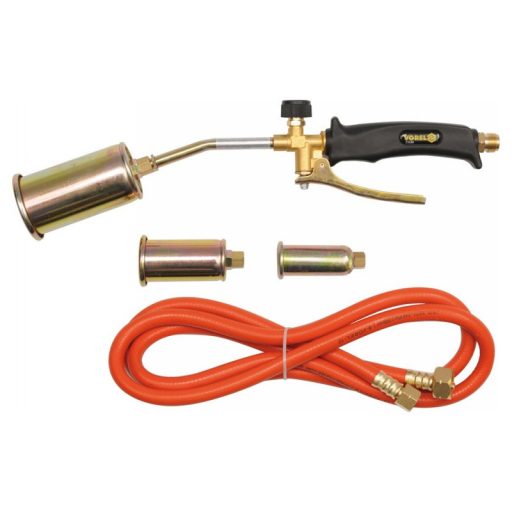 Basic set of short roofing burners 73340 designed for typical heat-sealed membrane installation work. Includes handle with valve lever labor saving, hose with connections to the cylinder and handle, and three flame nozzles for intense heating or tanning.