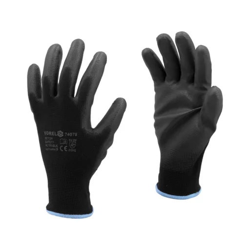 Work gloves made of black polyester, coated with black polyurethane on the gripping part. The seamless construction ensures high comfort and excellent feel of the held object.