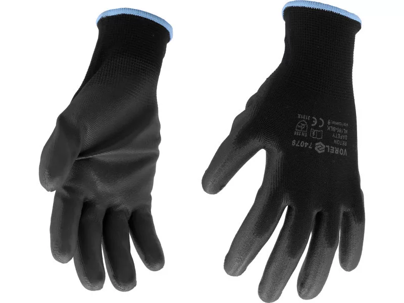Work gloves made of black polyester, coated with black polyurethane on the gripping part. The seamless construction ensures high comfort and excellent sensitivity to the held object.