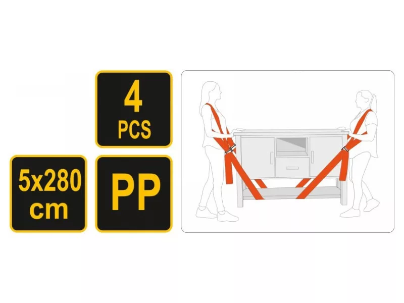 Belts made of durable polypropylene fabric. Designed for carrying furniture or other heavy facilities, e.g. during removals. The belts, depending on the model, put on the back / like a harness / or forearm, greatly facilitate the transfer of heavy, large objects, reducing effort and increasing work safety, while protecting the transmitted furniture from damage. A wide range of models offered allows you to choose belts best suited to current needs. Dimensions 5 x 280 cm. Includes 2 belts -steel storage with steel buckles worn on the back and 2 load support belts. Three connection options /length /length /. For transport, carrying heavy facilities, e.g. furniture during removals.