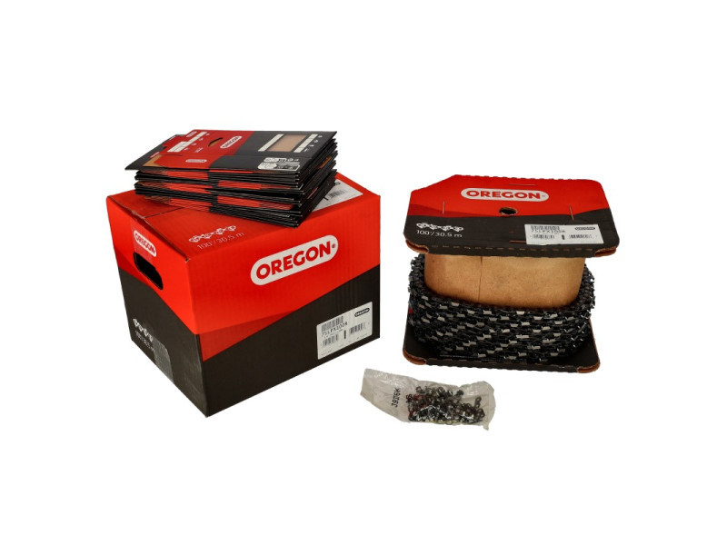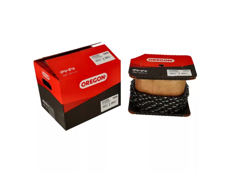 Oregon gyártmányú fűrészlánc, 100 lábas tekercsben.