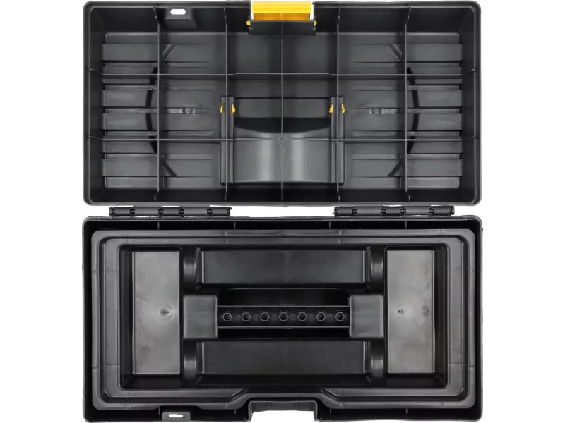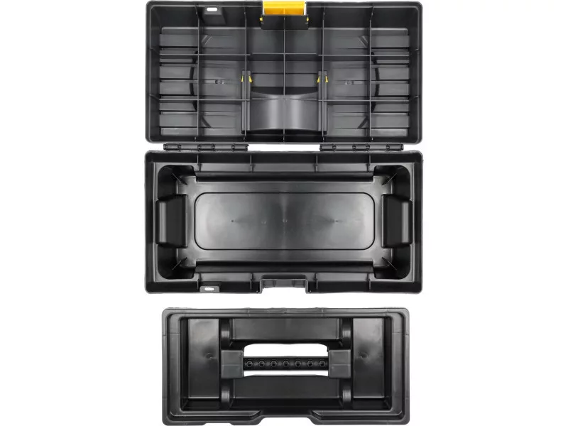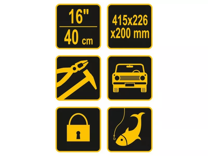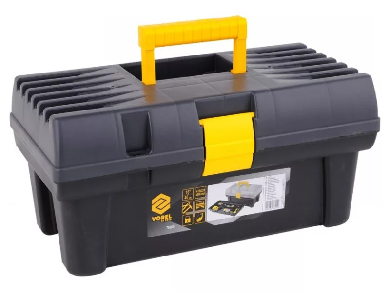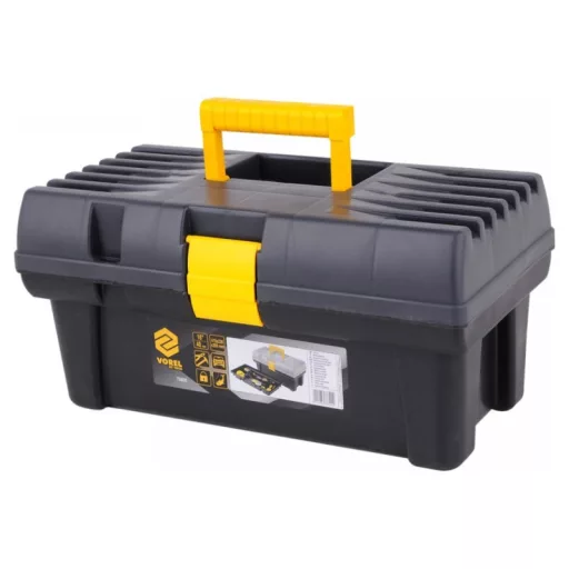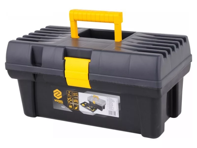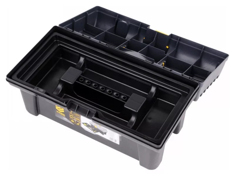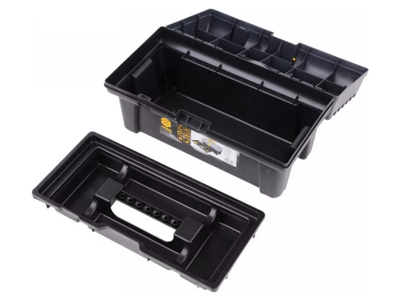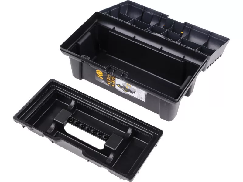 16 "toolbox with pull -out tray with bits handle. Made of plastic. A solid fastener prevents unwanted opening during carrying. The box has specially profiled side handles to make it easier to carry. . Tools, fishing accessories, etc.