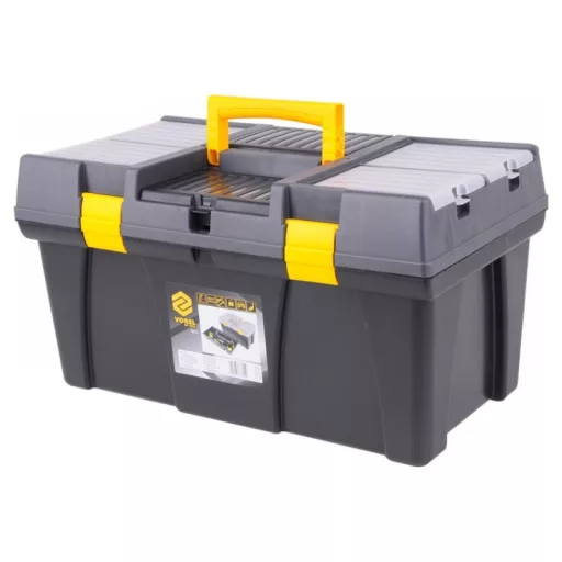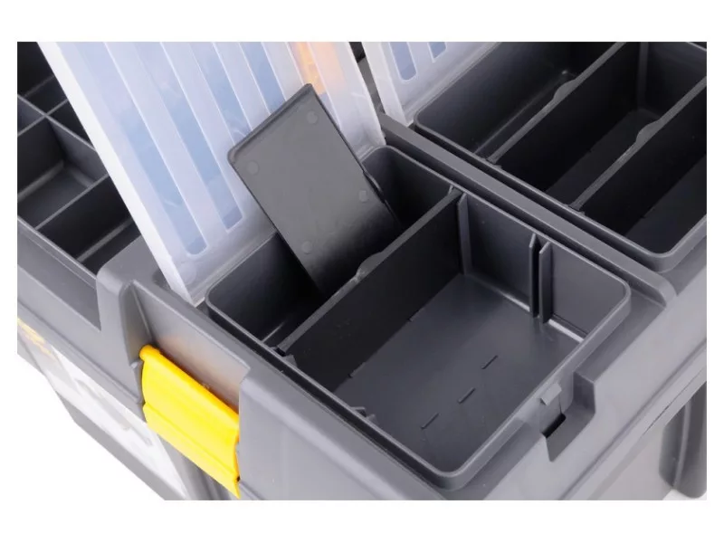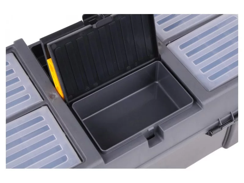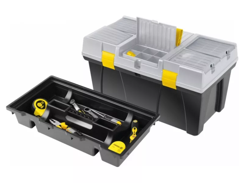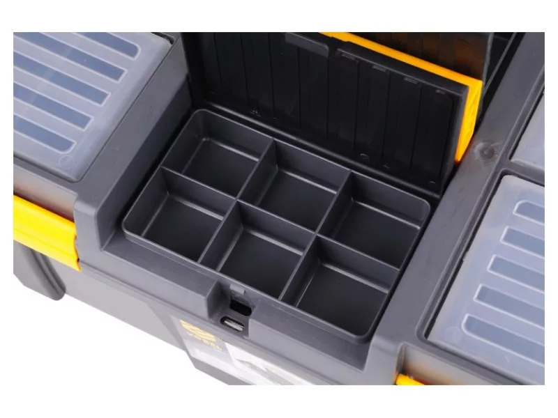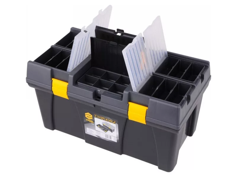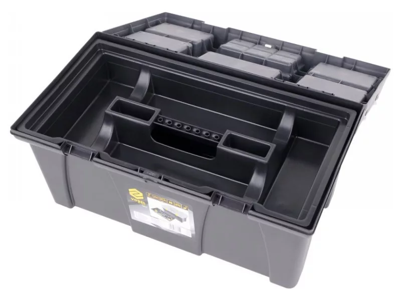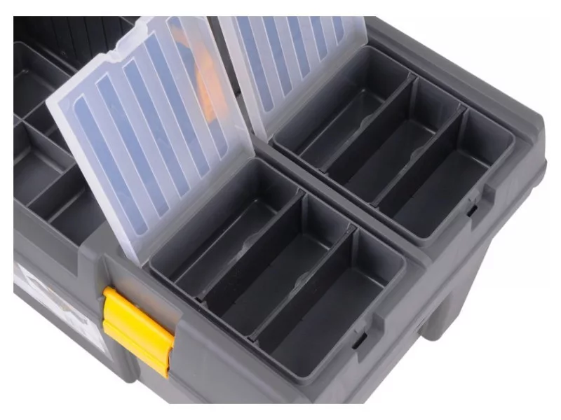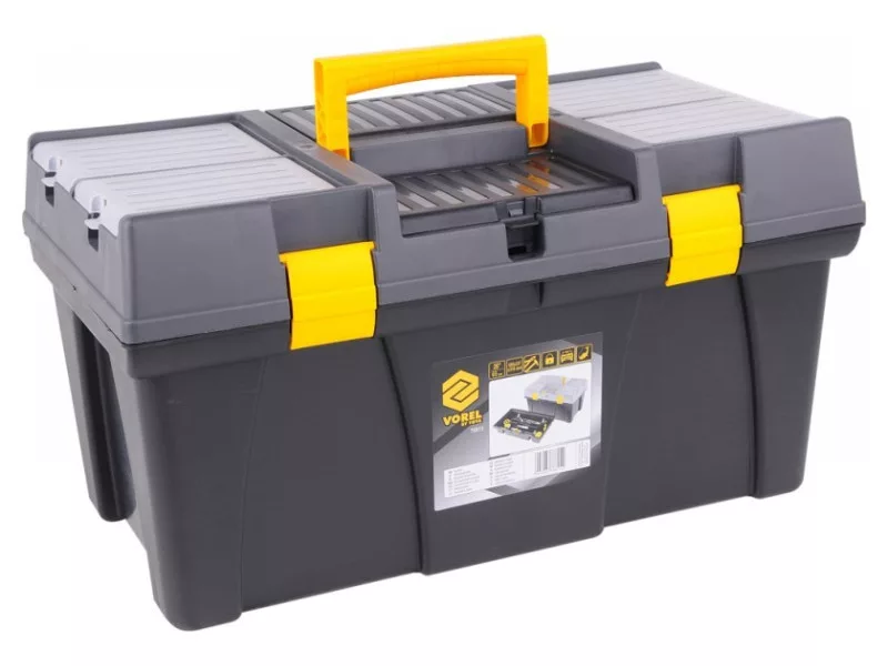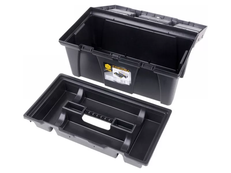 26" tool box with pull-out tray with bit holder and additional organizers for storing small itemsów.