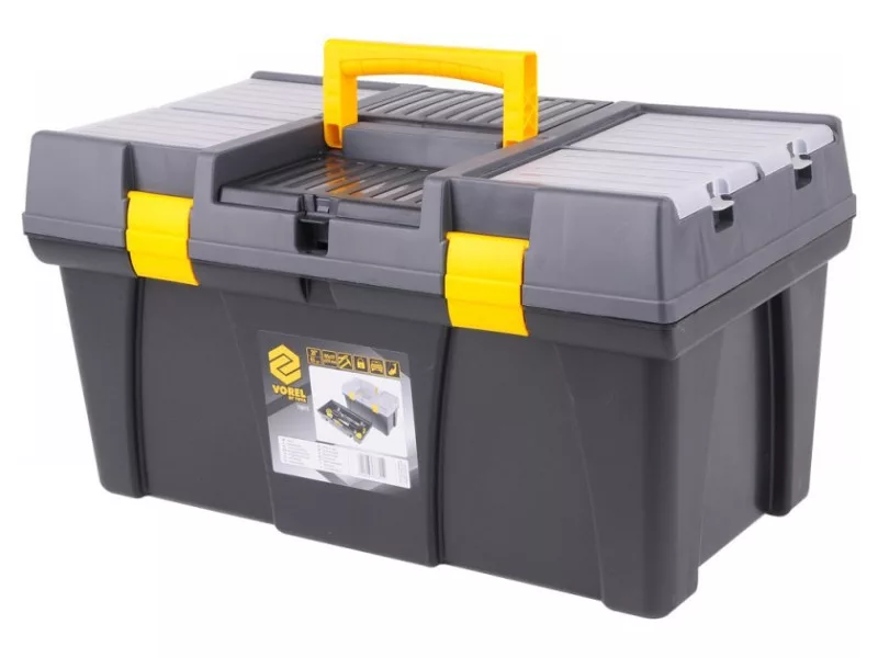 Made of plastic. A sturdy clasp prevents unwanted opening during handling. The box has specially contoured side handles for easy carrying. It is used for convenient transportation of various types of itemsóe.g. tools, fishing accessoriesóetc.