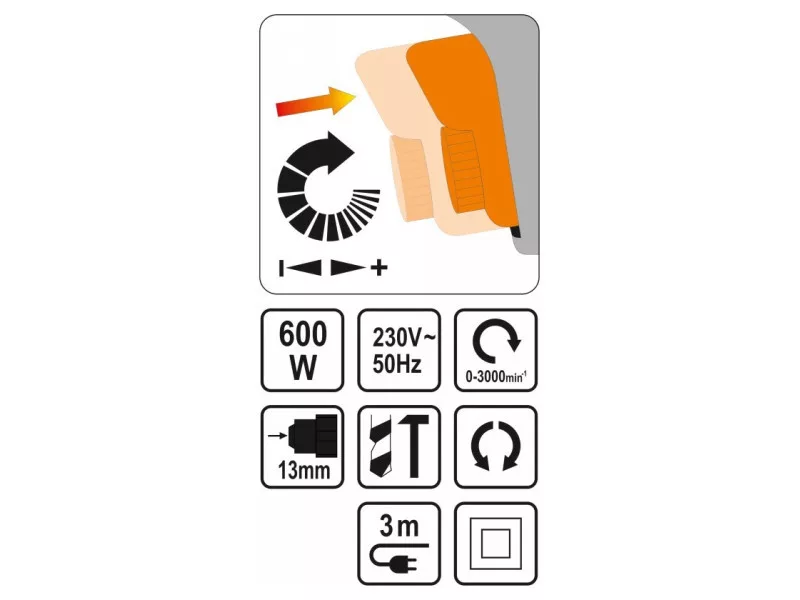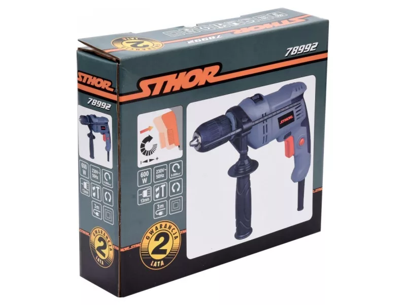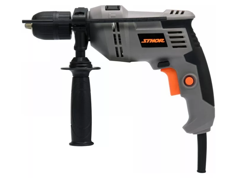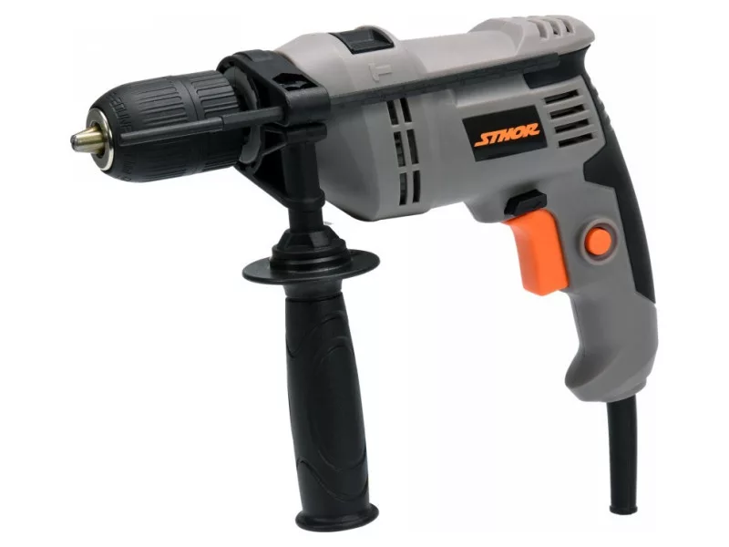 The hand-held percussion drill is an ordinary power tool, designed for drilling holes in a variety of materials: metals, wood, plastics, concrete, masonry, etc., using cylindrical shank drill bits appropriate for the material being worked on. The drill has functions of infinitely adjustable spindle speed, change of rotation direction, drilling with and without impact.