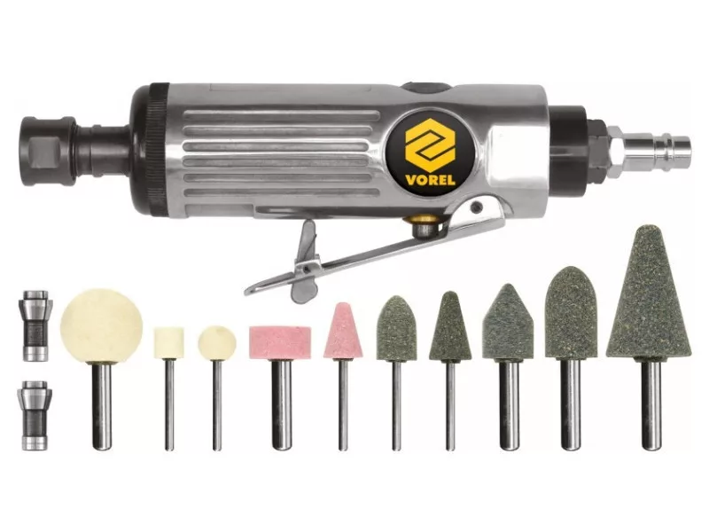 Simple pneumatic grinder with accessories, 10 parts. The pneumatic grinder is a tool powered by a stream of compressed air under the right pressure. With the help of cutting and sanding discs, it is possible to cut and grind various materials.