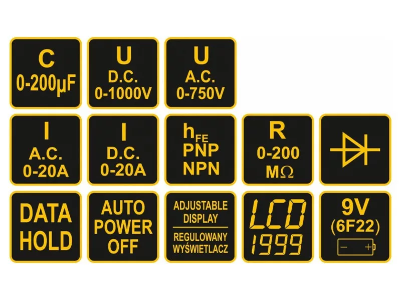 - Transistor hFe test: 0-1000, built-in measurement socket