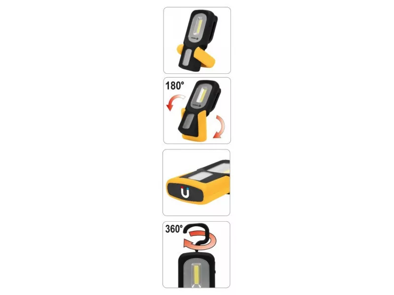 Performance workshop lamp with built-in rechargeable lithium-ion battery with capacity 800 mAh, providing 4 hours of continuous operation.