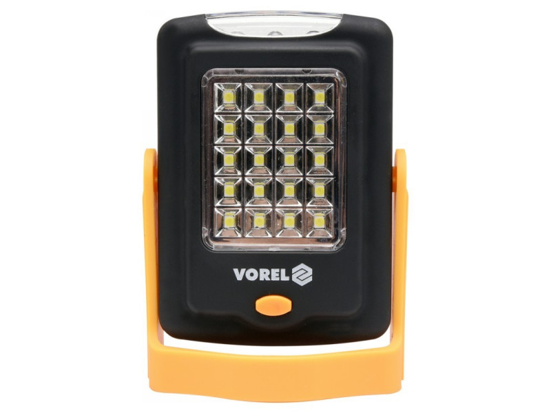 82730 is a handheld lamp equipped with 20 state-of-the-art SMD LEDs providing a robust, diffused light output. The lamp can also emit focused light, serving the function of a flashlight, thanks to three additional LEDs installed on the lamp's forehead. The fixture has a highly functional mounting bracket that can be bent 360 around the body of the lamp. In the base of the holder there is a strong magnet. This arrangement allows the lamp to be positioned anywhere and tilted at any angle, leaving the user's hands free. The fixture also has a folding, rotating hook. The lamp is powered by 3xAAA batteries, which are not included.