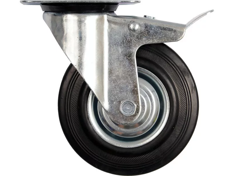 Wheel diameter 160 mm with swivel mount, bearing, with brake, tire made of black rubber, height 195 mm.