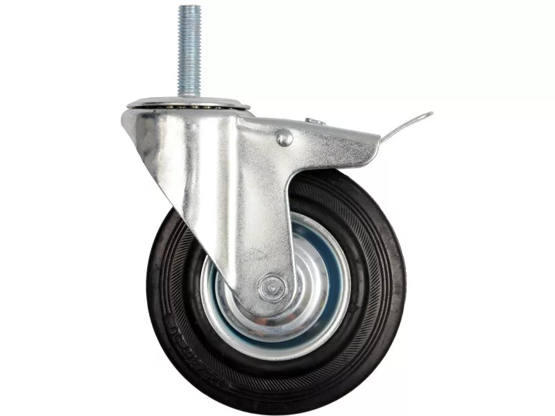 Wheel diameter 125 mm, swivel, with threaded stem mounting, bearing, with brake, tire made of black rubber, height 153 mm.