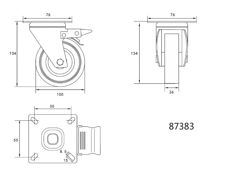 Swivel wheel diameter 100 mm, bearing, with brake and fixing plate, raceway made of gray rubber. Swivel wheel diameter 100 mm, bearing, with brake and fixing plate, raceway made of gray rubber.