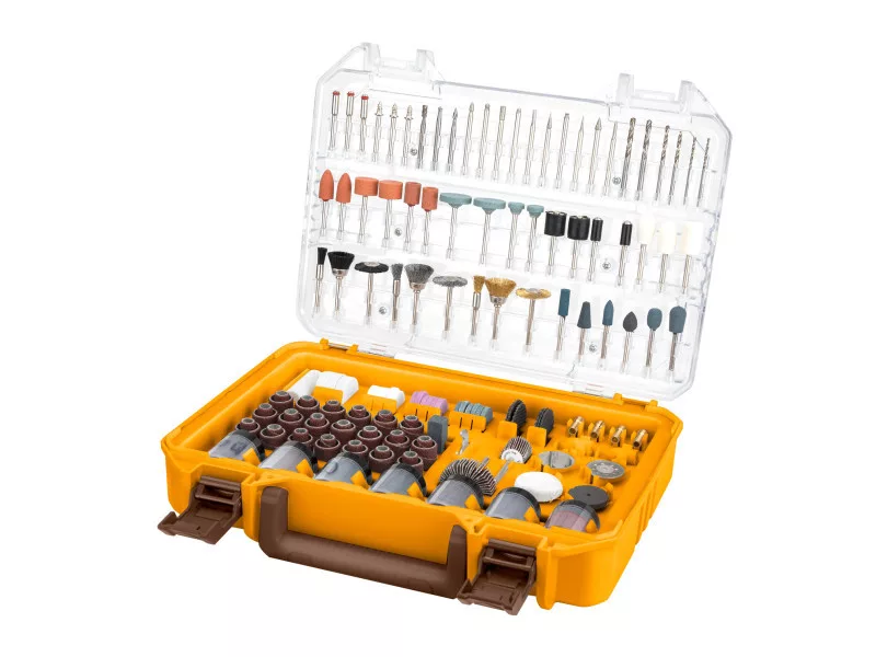 Lieferumfang: 40 Schleifringe, 7 grobe Tücher, 2 Filze, 1 Stoffpolierscheibe, 4 Gummipolierscheiben, 6 Spiralbohrer, 3 Tauchsägen, 1 Diamantkreissägeblatt, 1 Edelstahlkreissägeblatt, 3 Spindeln für Schleifscheiben, 10 King Kong Schleifstifte, 10 Diamantschleifköpfe, 9 Schleifköpfe, 9 Bürsten, 4 Spannfutter, 6 Trennscheiben, 1 Gummischleifscheibe, 18 Schleifscheiben ohne Spindel, 1 Schleifstein, 1 Schlüssel, 120 Schleifscheiben, 157 Schleifpapiere, 1 Paste, 3 Bits, im Koffer