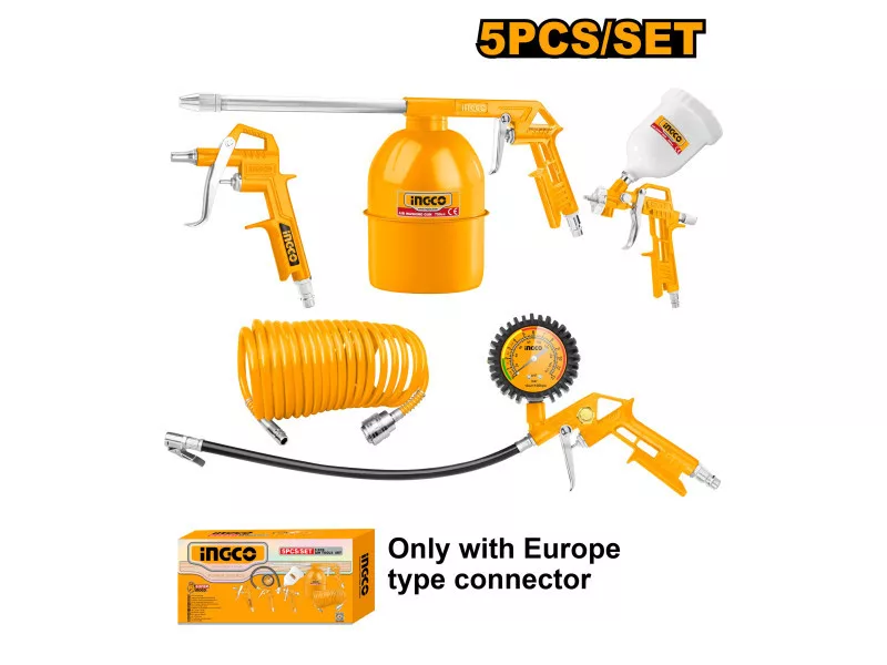 Lieferumfang: Flexibler Schlauch, Ausblaspistole, Farbspritzpistole, Ölspritzpistole, Reifenaufblasgerät, im Karton