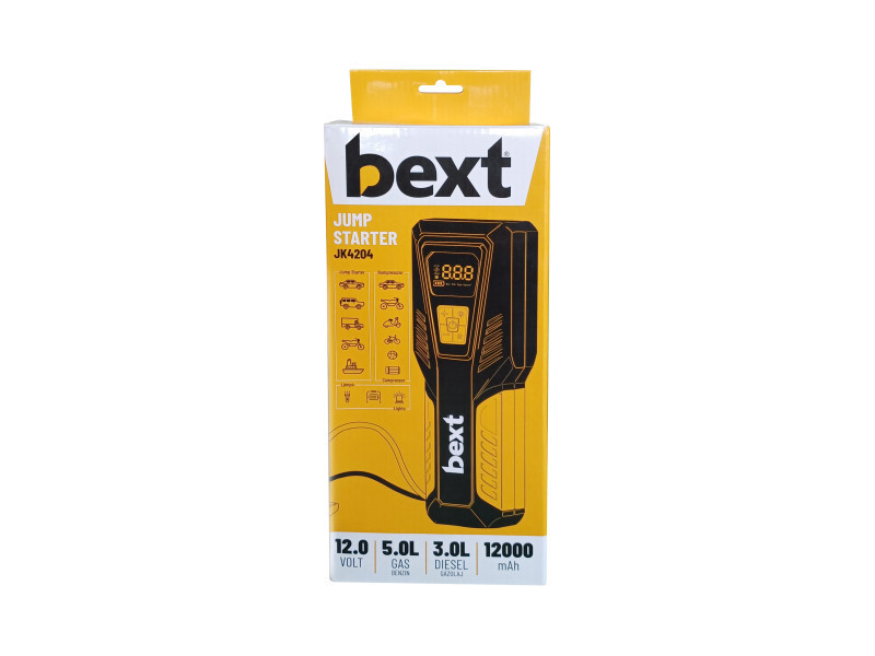 Der BEXT JF4204 Jumpstarter ist ein multifunktionales Gerät mit einem LCD-Display: Schnellstartsystem, Kompressor (10 bar), Powerbank (12 Ah), Taschenlampe und Notblinklicht, Fensterglasbrecher Hammer.