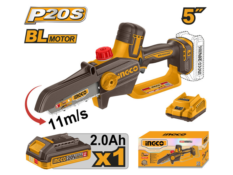 INGCO akkus láncfűrész 127 mm, szénkefe nélküli, 2,0 Ah akkuval