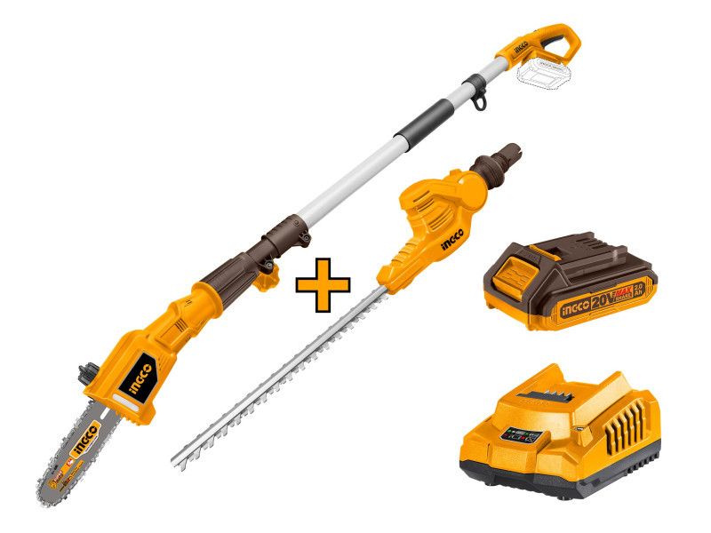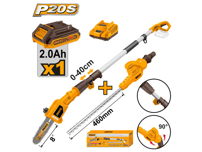 INGCO Akku-Hochentaster 460 mm und Astsäge 200 mm 0-400 mm 20 V (1 x 2,0 Ah Akku + Ladegerät)