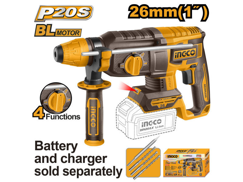 Az INGCO 20V-os akkus kombikalapács erős és sokoldalú szerszám beton, acél és fa fúrásához, valamint vésési feladatokhoz. A szénkefe nélküli motor nagy hatékonyságot, hosszabb élettartamot és stabil teljesítményt biztosít intenzív használat mellett is.
