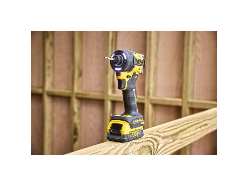Unser leisester 18 V XR Impact Driver verfügt über einen hydraulischen, ölgefüllten Mechanismus, der präzise Leistung bei weniger Vibration bietet und die Langlebigkeit des Werkzeugs erhöht. Der DCF860 liefert ein Drehmoment von 56 Nm in einem kompakten 100-mm-Gehäuse, das die Befestigungsleistung des DCF850 bei deutlich weniger Lärm erfüllt. Weitere Funktionen sind ein 3-Modus-Schalter für verbesserte Kontrolle. Der superhelle 9-LED-Ring strahlt eine Lichtleistung von 82 Lumen aus und verfügt über einen Taschenlampenmodus.