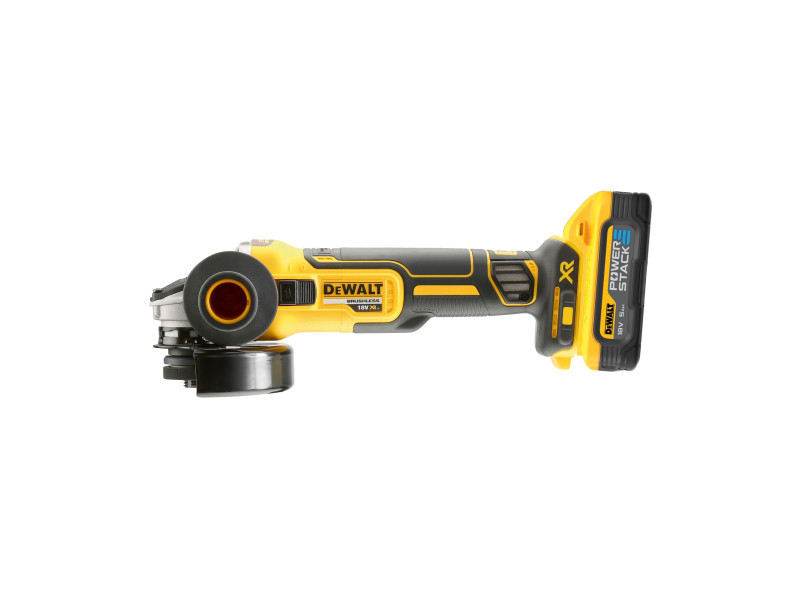 DEWALT Akkus sarokcsiszoló 125 mm 18 V szénkefe nélküli 125 mm (2 x 5,0 Ah akku + töltő + TSTAK)