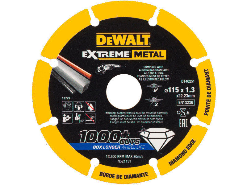 Die EXTREME Metallschneidscheiben sind mit Diamantentechnologie für außergewöhnliche Haltbarkeit und maximale Arbeitseffizienz ausgestattet. Sie machen über 1000 Schnitte, mehr als 30 Mal mehr als dünne Bindemittelschneidsteine.