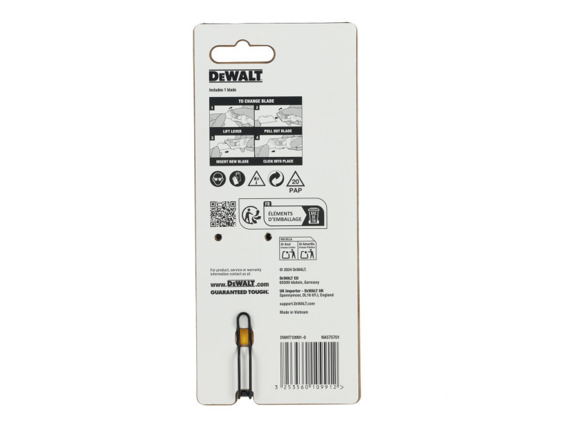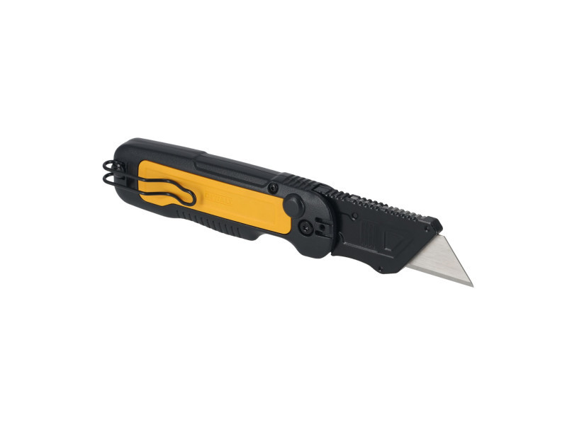 Das DEWALT® Push and Flip Klappmesser mit Trapezklinge bietet ein breites Spektrum an Schneidanwendungen. Mit seinem ergonomischen Design ist es auch bei schweren Arbeiten bequem zu tragen und kann mit einer Hand aufgeklappt werden. Mit einem Handgelenksschwenk ermöglicht es einen schnellen Zugang zur Klinge. Das schnell gleitende und klickende Klingentauschsystem hält die Klinge fest und hilft, das versehentliche Auslösen der Klinge zu verhindern. Das für Langlebigkeit konzipierte Messer mit Metallgriff bietet hohe Leistung für eine Vielzahl anspruchsvoller Aufgaben und kann mit dem umkehrbaren Taschenclip und dem integrierten Seilloch sicher befestigt werden, wenn in der Höhe gearbeitet wird.