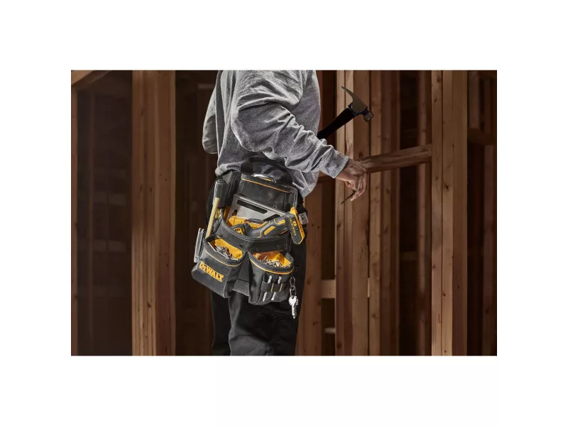 Die professionelle Werkzeuggürteltasche von DeWALT (DWST40603-1) wurde speziell für die getrennte Aufbewahrung von Schrauben und Nägeln entworfen. Zusatztaschen bieten Platz für Maßband, Farbschnur, Bit-Set, Zangen und andere Werkzeuge. An der Oberkante der Tasche befindet sich ein massiver Griff, falls sie nicht am Gürtel getragen, sondern in der Hand gehalten werden soll. Die Anzahl der Taschen und Halterungen auf dieser einen Tasche beträgt 13!
